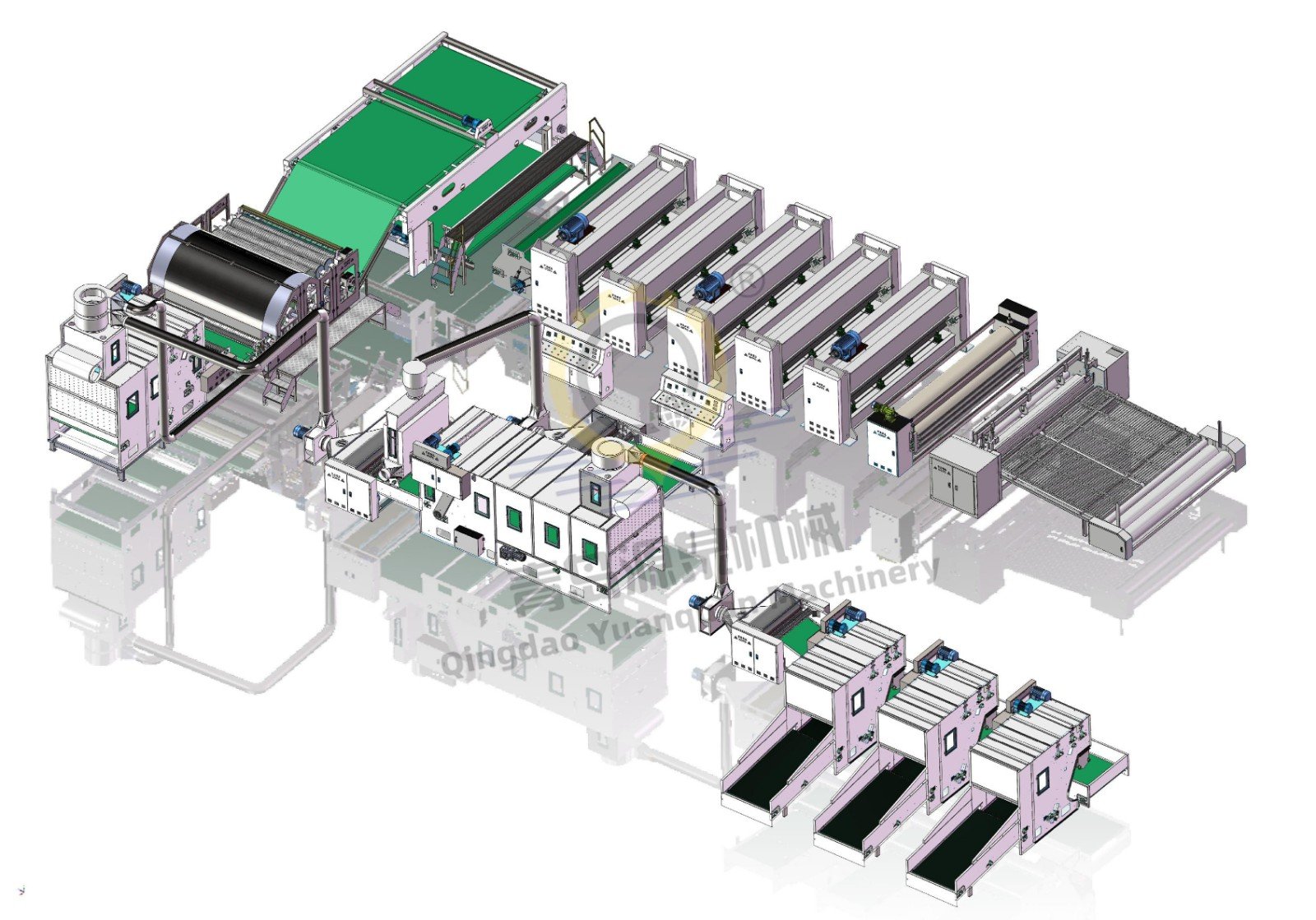 التمشيط وتشكيل الشبكة: باستخدام عناصر تمشيط عالية السرعة مثل الأسطوانات والدوفير، يتم فصل حزم الألياف إلى ألياف فردية ووضعها في شبكة موحدة، مما يضمن اتساق الكثافة بين 400 و3000 جرام للمتر المربع.